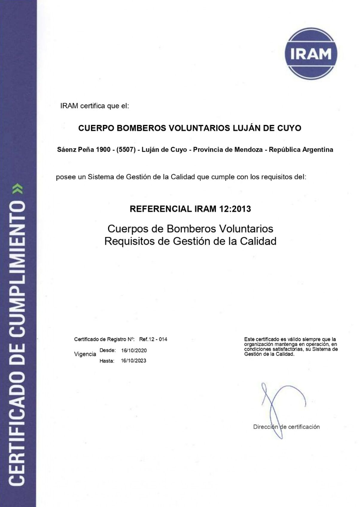 En un acto realizado en el SUM del Cuartel de Bomberos Voluntarios de Luján de Cuyo, se entregó el lunes 21 de febrero la recertificación de IRAM para el Referencia 12.