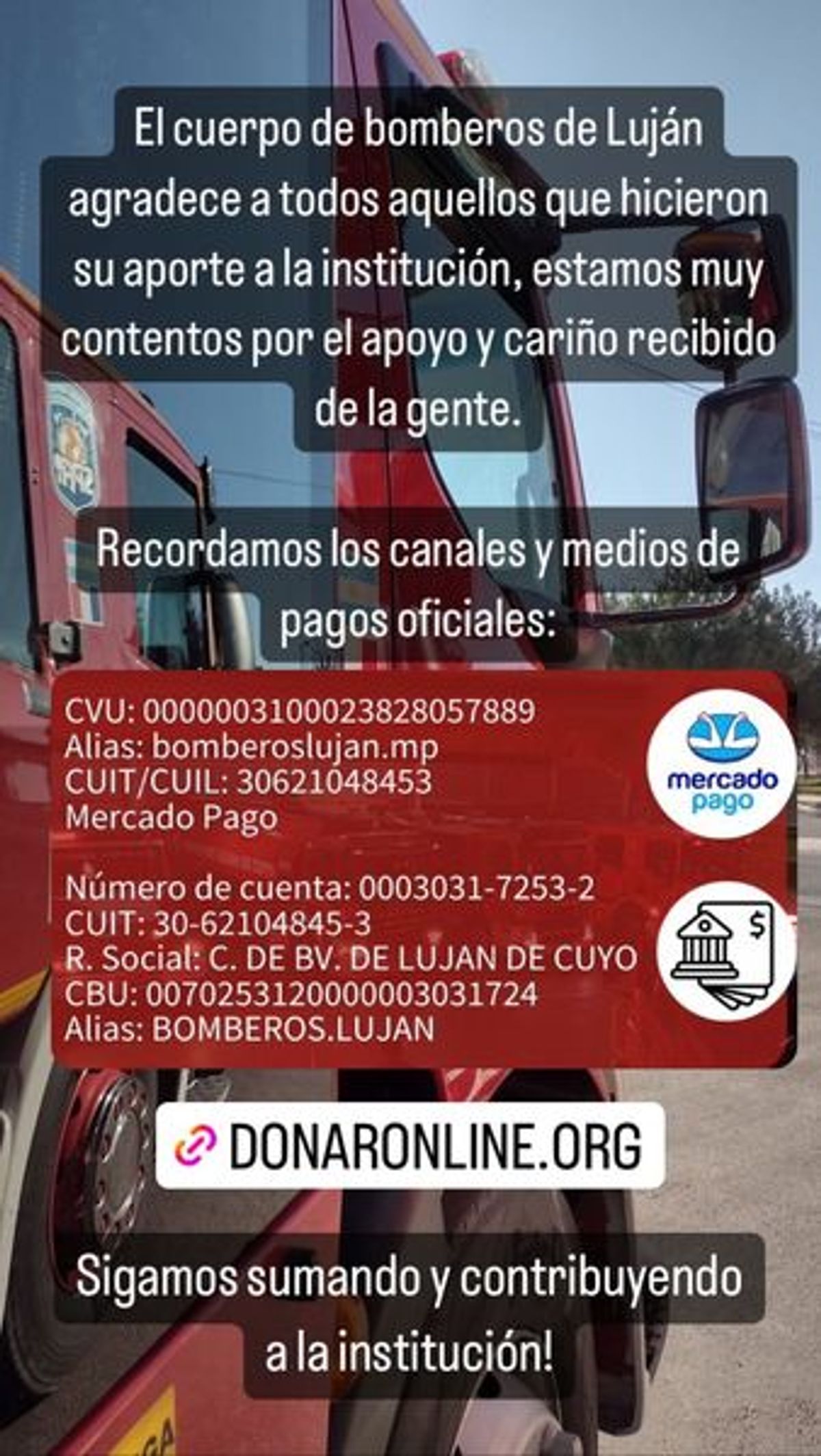 También podes hacer tu aporte a través de los siguientes medios de pago:CUERPO DE BOMBEROS VOLUNTARIOS DE LUJANCVU: 0000003100023828057889Alias: bomberoslujan.mpCUIT/CUIL: 30621048453Mercado PagoNúmero de cuenta: 0003031-7253-2CUIT: 30-62104845-3Razón Social: CUERPO DE BOMBEROS VOLUNTARIOS DE LUJAN DE CUYOCBU: 0070253120000003031724Alias: BOMBEROS.LUJANhttps://donaronline.org/cuerpo-de.../comunidad-solidaria