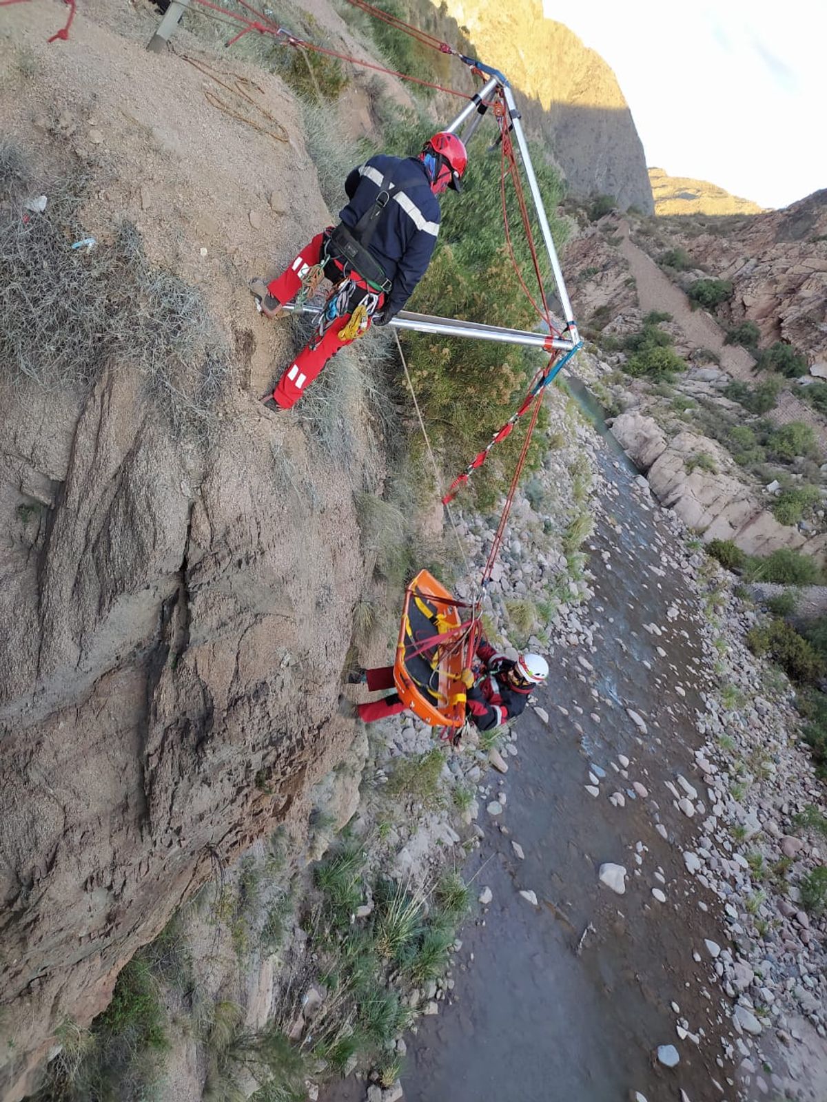 Integrantes del Grupo GRIMP participó de una práctica de rescate en pared, en un precipicio de Cacheuta, utilizando la herramienta BIPODE, elemento que brinda gran seguridad a la maniobra. En el lugar trabajó parte del equipo, a cargo Oficial Fabio Ortiz, Sargento Federico Brian, Bombero Nicolás Ahumada, Bombero Anibal Silveira y Bombero Marcos Lucero.
